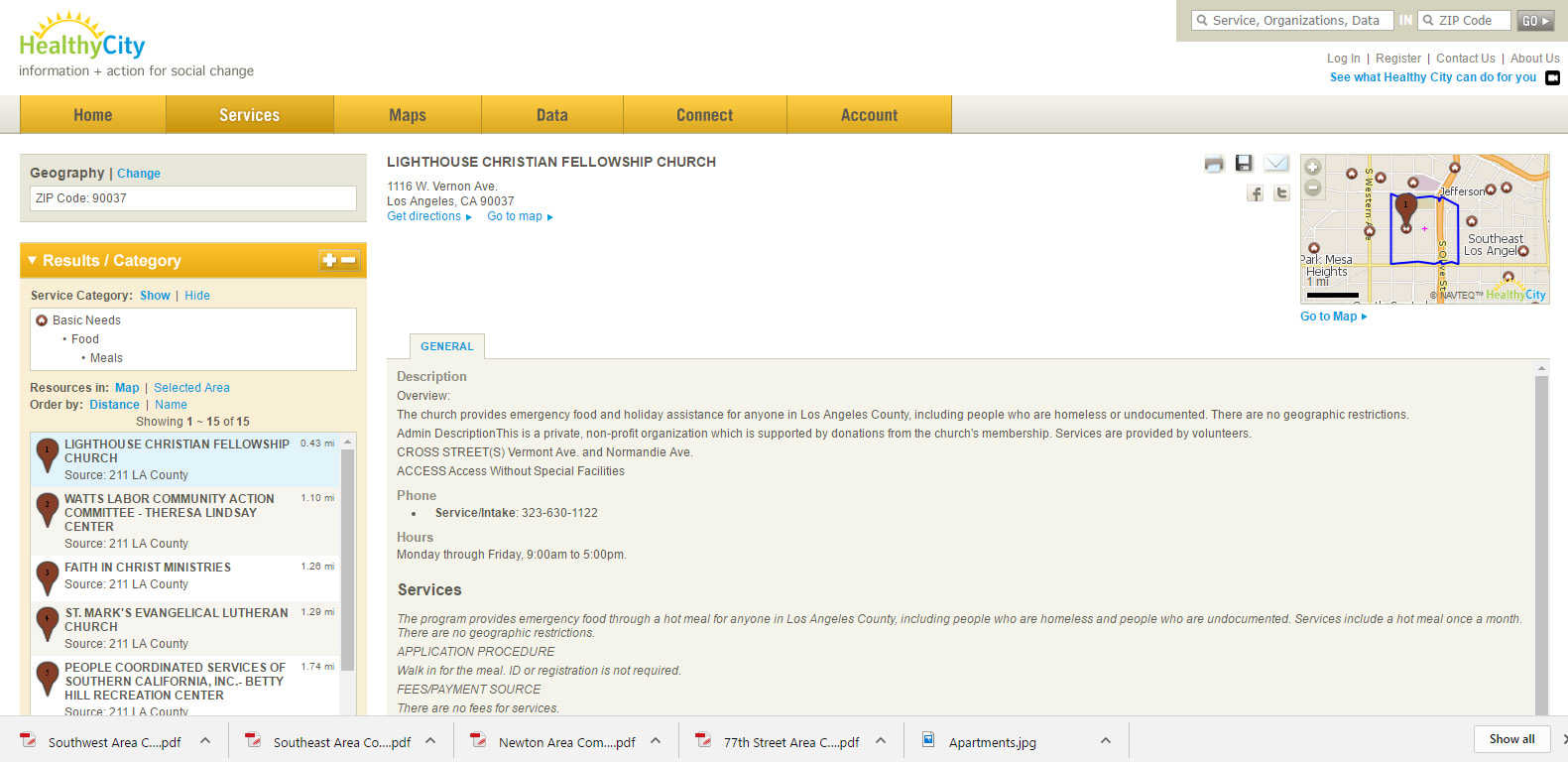 Below is a sample screen of a search in zip code 90037 for Services/Basic Needs/Food/Meals