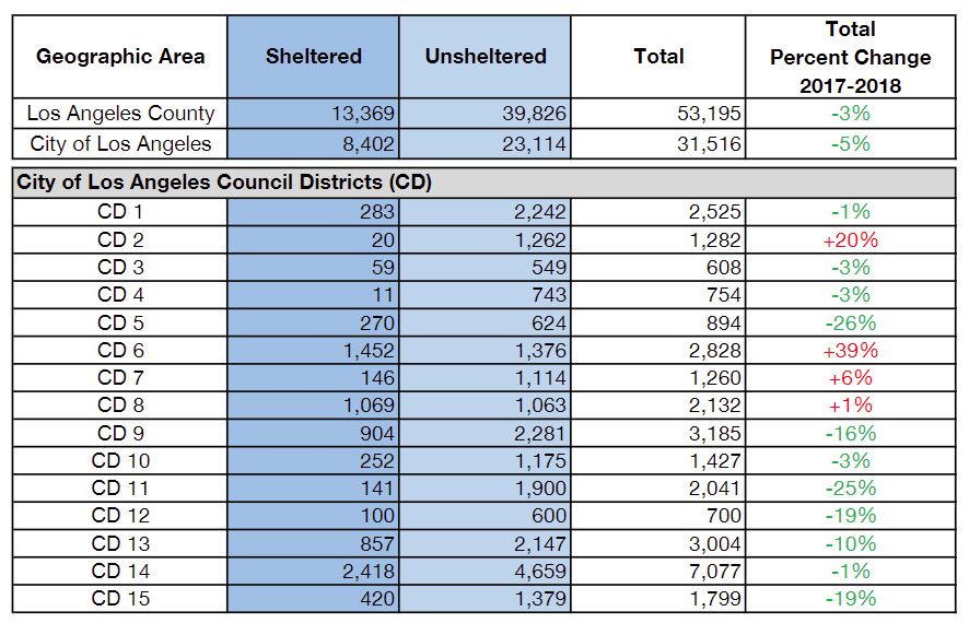 By now everyone has seen the gross numbers. For the county, the homeless are down from 55,048 in January 2017 to 53,195 in January 2018; for the city, it was a little better, dropping from 38,138 to 31,516. We will dig into the details further on.