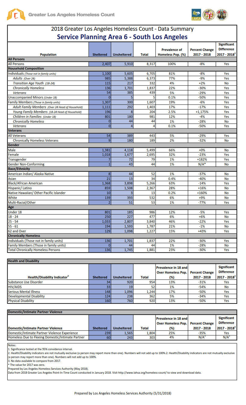 The LAHSA handout at the May 31 event contained only a brief summary of the main points of the findings. The LAHSA website (www.lahsa.org ) has more details, and still more data will be posted there in the future. Following are some of the details, city or countywide, particularly focusing on South Los Angeles, which is of special interest to us.